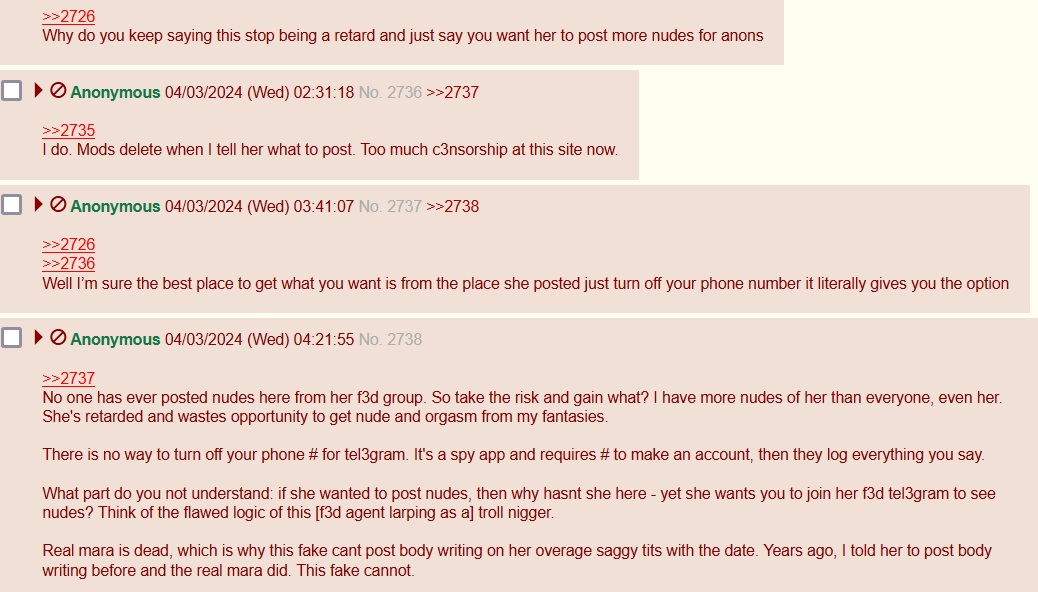 {{{">>2722\nBros dont go there, it's a honeypot f3d trap. Real mara is dead and they took her phone. Thats why the dumb nigger doesnt post any new nudes even tho fake mara claims \"I’ve lost like 25 pounds\" and \"im 18\" now. No attention whore would not post nudes if she lost weight. \n\nThat tel3gram is a honeypot to get personal info, IP, to bm you. \n\nIf she was real, shed post new nudes with date stamp on this anon site, instead of f3d phone number app." | renderPostMessage 2726}}} |