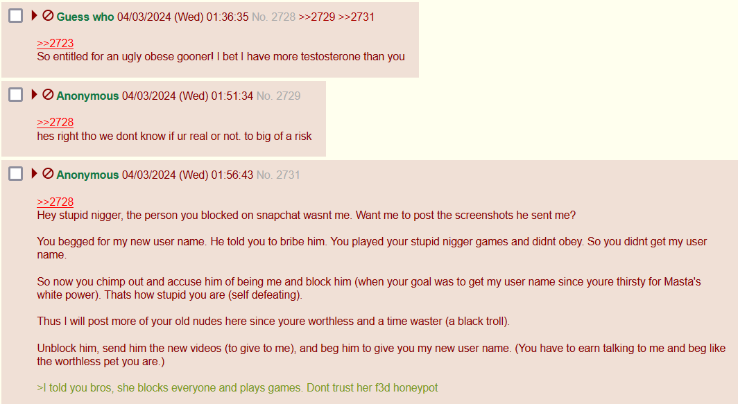 {{{">>2751\nIt’s looking like the nigger (the f3d impersonating her) doesn’t show nudes at her t3le honeypot and it was just a larp, that’s why no one returned to post her nudes and the attention whore didnt do it herself (because shes not alive anymore)." | renderPostMessage 2752}}} |